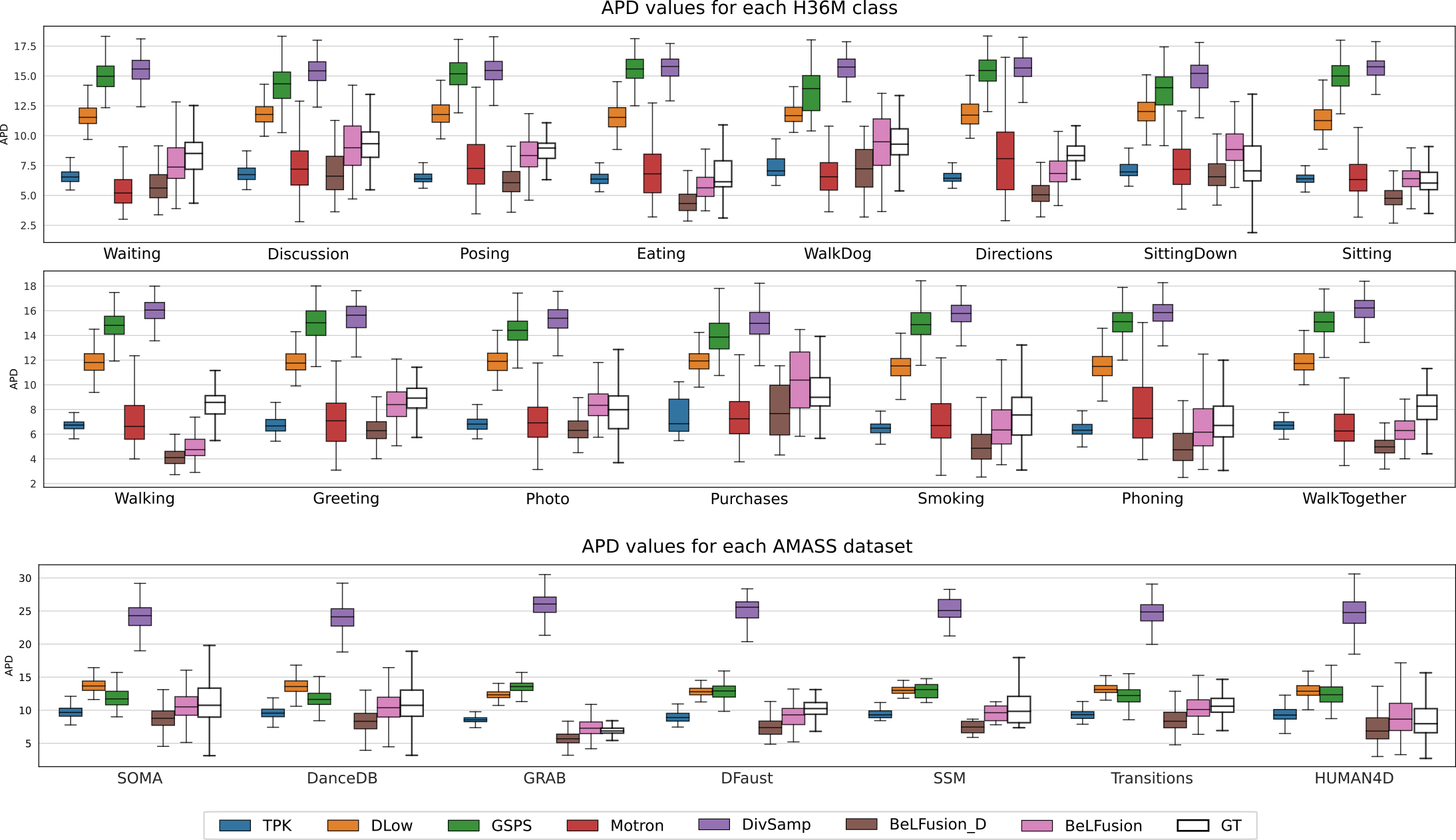 Figure below shows the evolution of 10 superimposed predictions along time in two actions from H36M (sitting down, and giving directions), and two datasets from AMASS (DanceDB, and GRAB). First, the acceleration of GSPS and DivSamp at the beginning of the prediction leads to extreme poses very fast, abruptly transitioning from the observed motion. Second, it shows the capacity of BeLFusion to adapt the diversity predicted to the context. For example, the diversity of motion predicted while giving directions focuses on the upper body, and does not include holistic extreme poses. Interestingly, when just sitting, the predictions include a wider range of full-body movements like laying down, or bending over. A similar context fitting is observed in the AMASS cross-dataset scenario. For instance, BeLFusion correctly identifies that the diversity must target the upper body in the GRAB dataset, or the arms while doing a dance step.