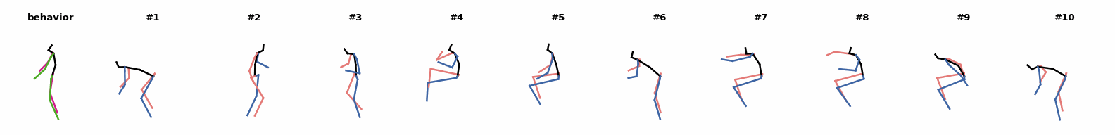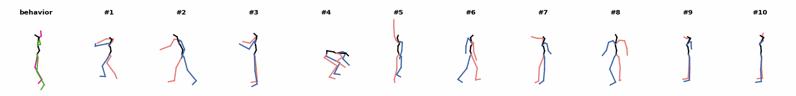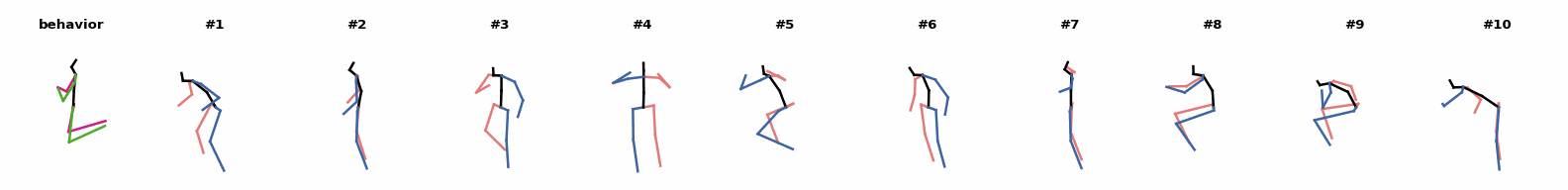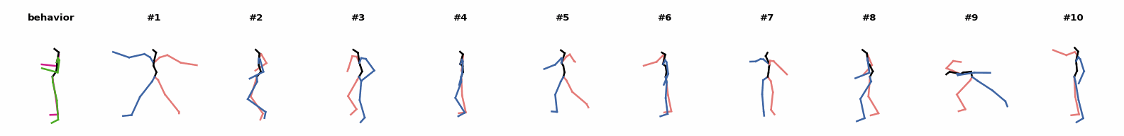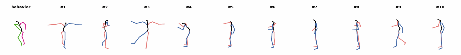 The motion tagged as behavior shows the target behavior to be encoded and transferred. All the other columns show the ongoing motions where the behavior will be transferred to. They are shown with blue and orange skeletons. Once the behavior is transferred, the color of the skeletons switches to green and pink.