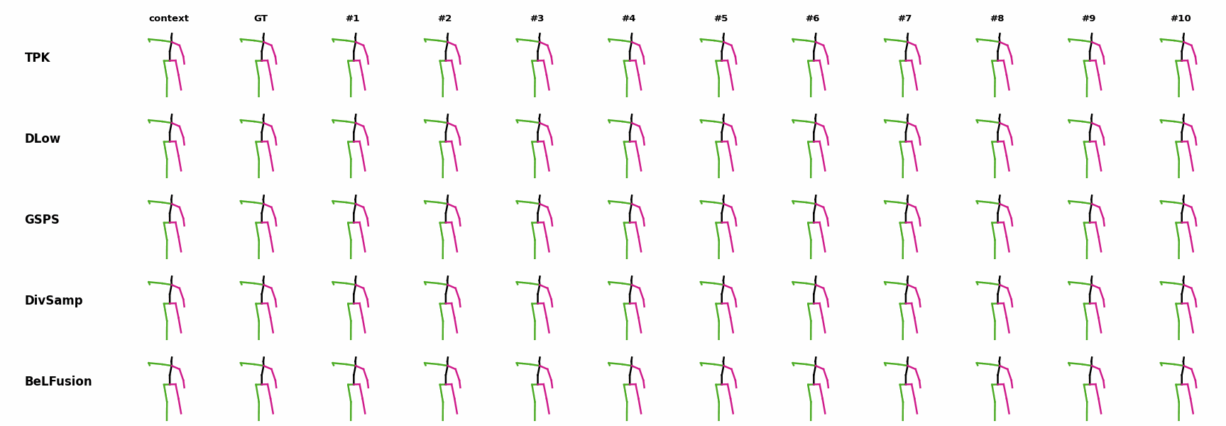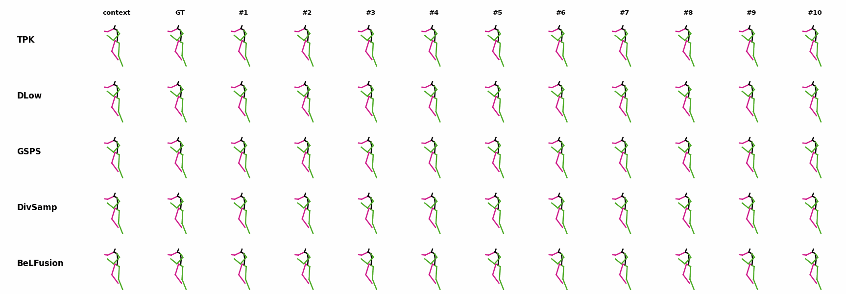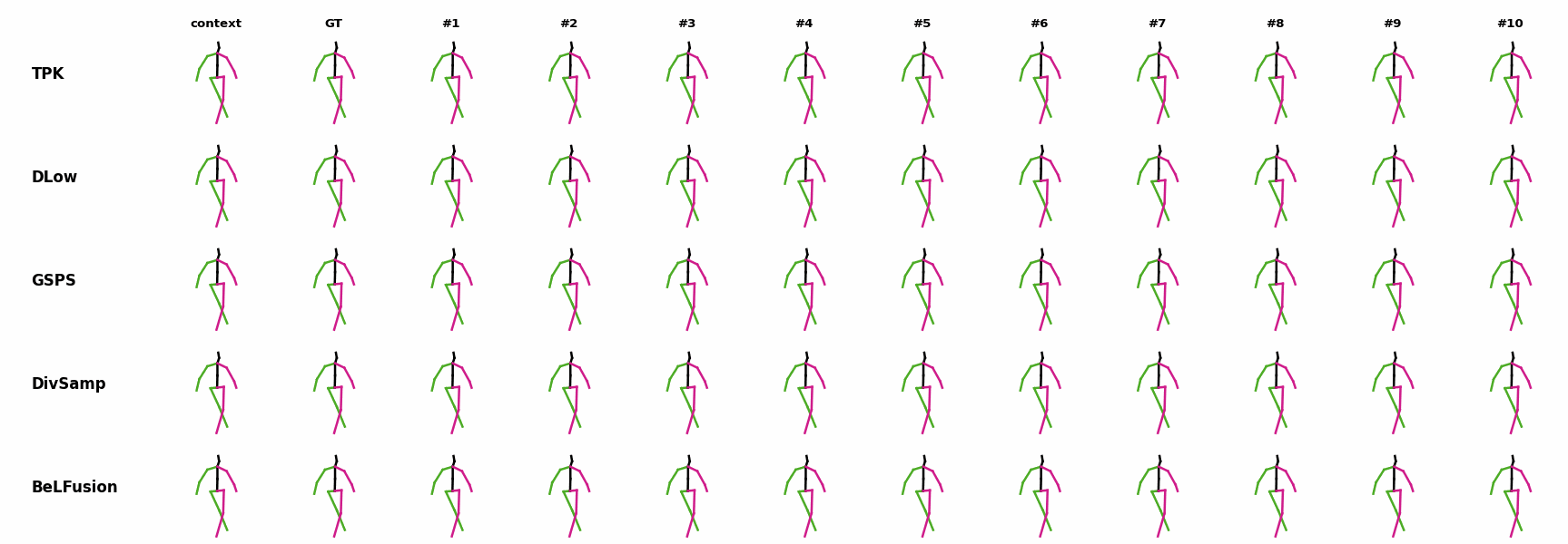 BeLFusion is able to detect that the dance moves involve keeping the arms arising while moving or rotating. In comparison, DLow, GSPS, and DivSamp simply predict other unrelated movements. TPK is only able to predict a few samples with fairly good continuations to the dance step.