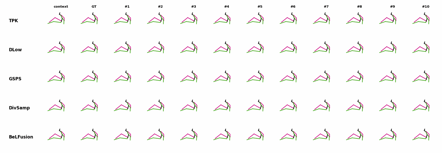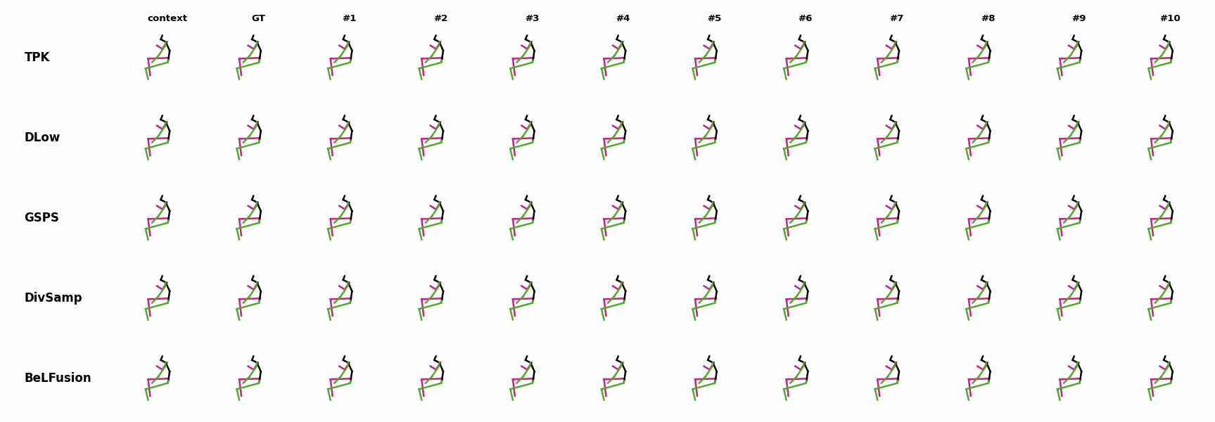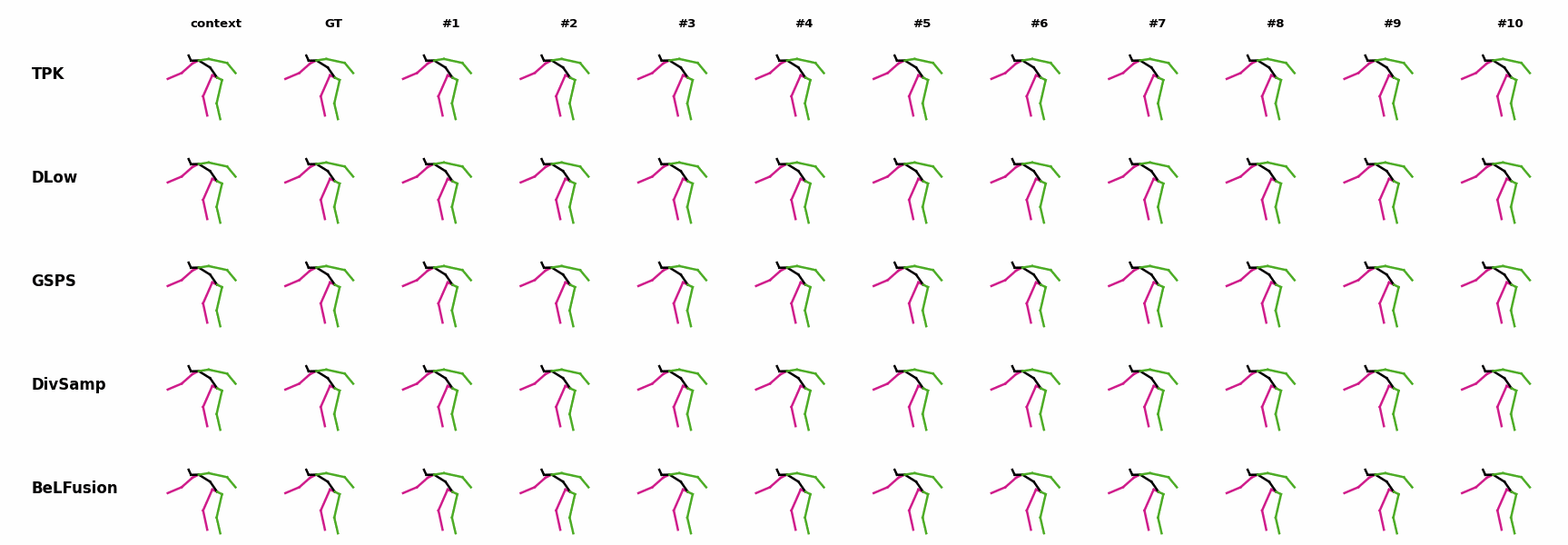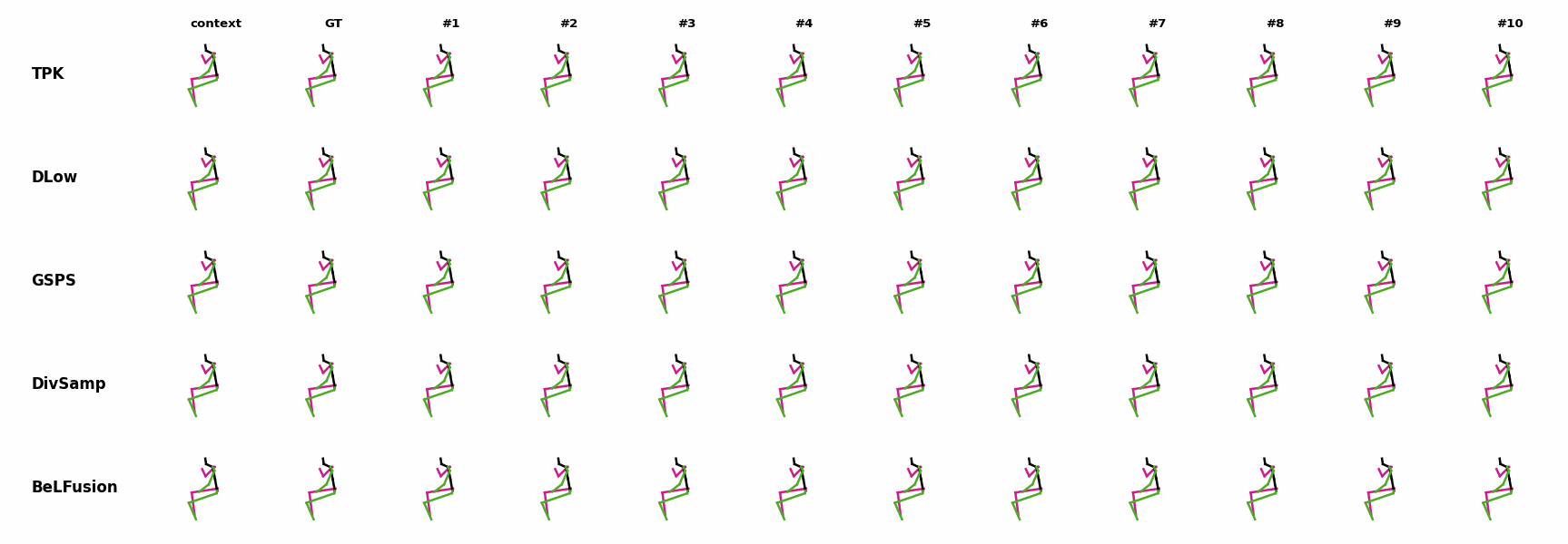 BeLFusion is able to detect that the dance moves involve keeping the arms arising while moving or rotating. In comparison, DLow, GSPS, and DivSamp simply predict other unrelated movements. TPK is only able to predict a few samples with fairly good continuations to the dance step.