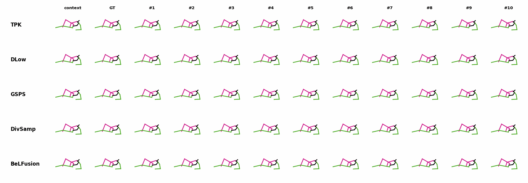 In general, BeLFusion provides good coverage of all plausible futures given the contextual setting. In this example, our model’s predictions contain as many different actions as all other methods, with no realism trade-off as for GSPS or DivSamp.